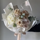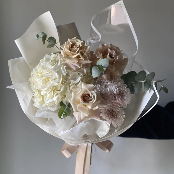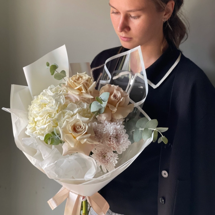 Воздушный букет в пастельных тонах — олицетворение нежности и гармонии. Кремовые розы, пышная гортензия и мягкие акценты хризантем создают ощущение лёгкости и тепла. Идеальный подарок, чтобы выразить самые искренние чувства
