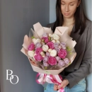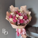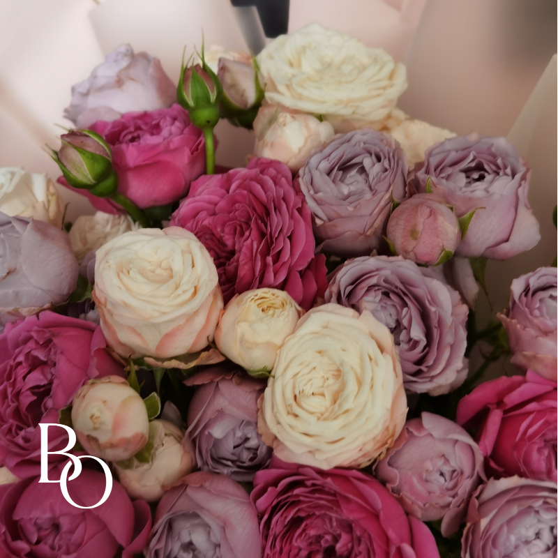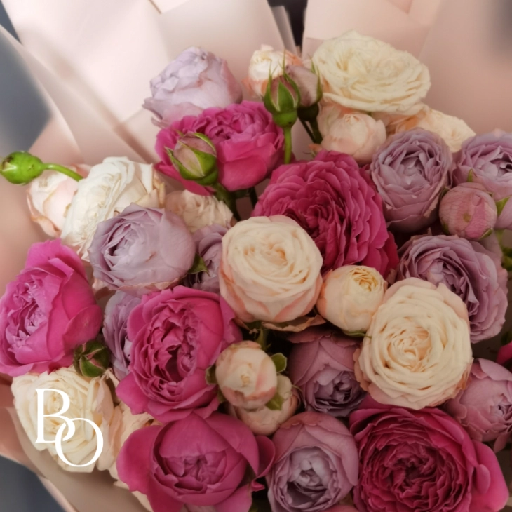 Этот изысканный букет сочетает в себе нежность и элегантность, созданный из великолепных кустовых пионовидных роз. Каждое соцветие словно напоминает о волшебстве весеннего сада, где цветы распускаются под тёплыми лучами солнца.