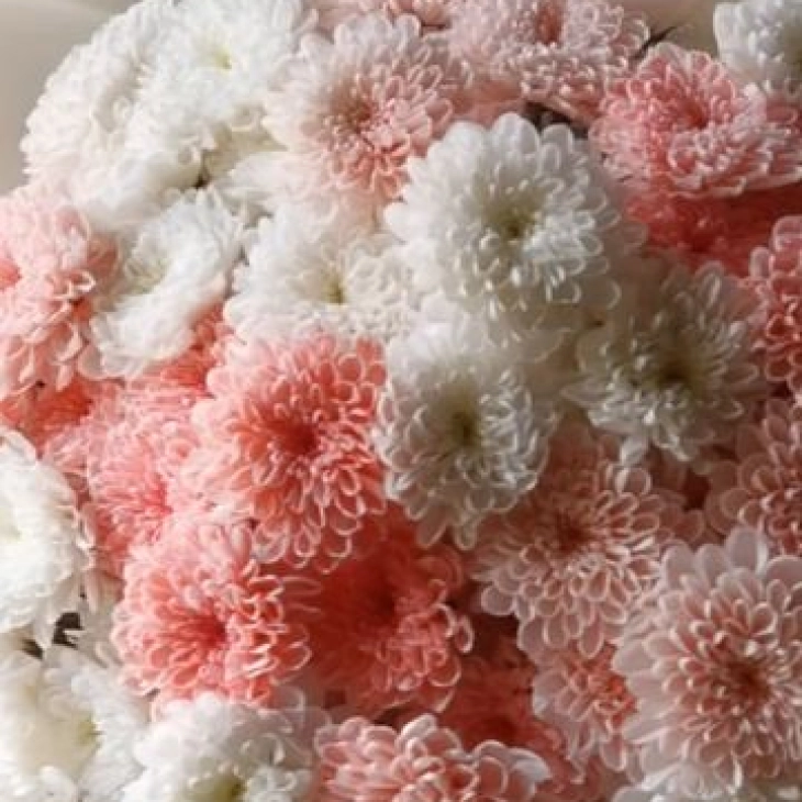 Большой воздушный букет из кустовых хризантем в нежных бело-розовых оттенках — это воплощение легкости и утончённой романтики.