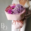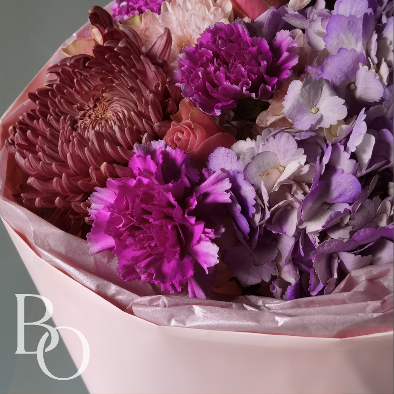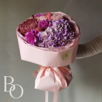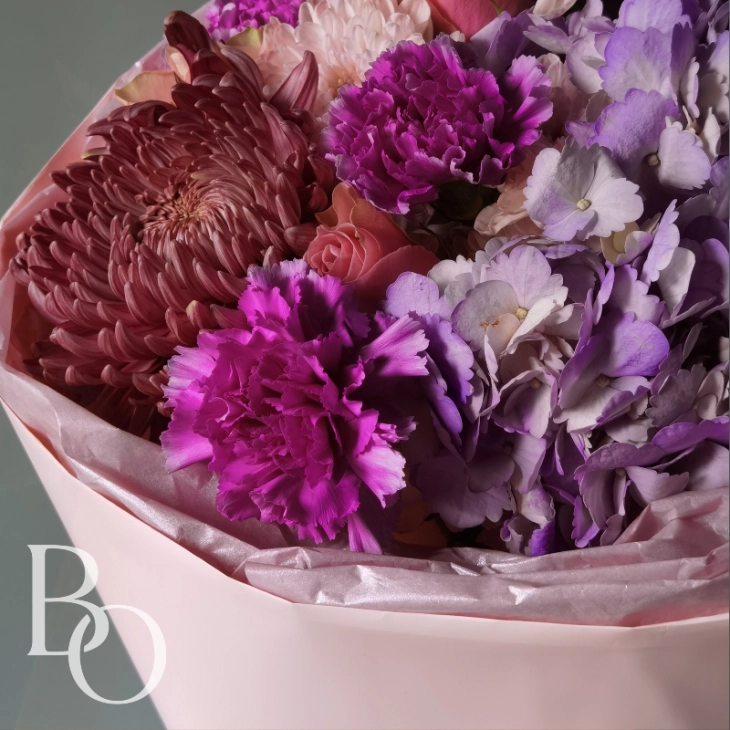 Состав: Хризантема одноголовая, Гортензия, Гвоздика, Хризантема кустовая, Роза (Эквадор)