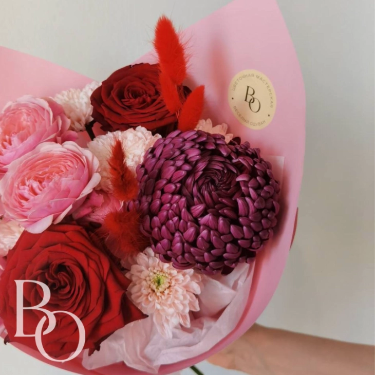 Состав: Лагурус (сухоцвет), Кустовая роза, Хризантема одноголовая, Хризантема кустовая, Роза
