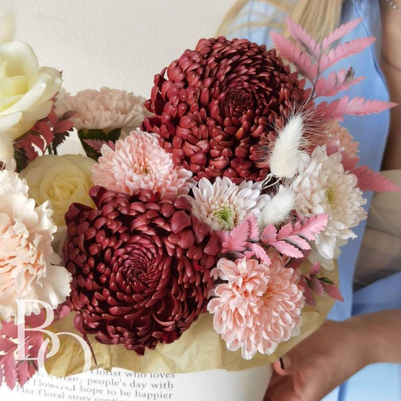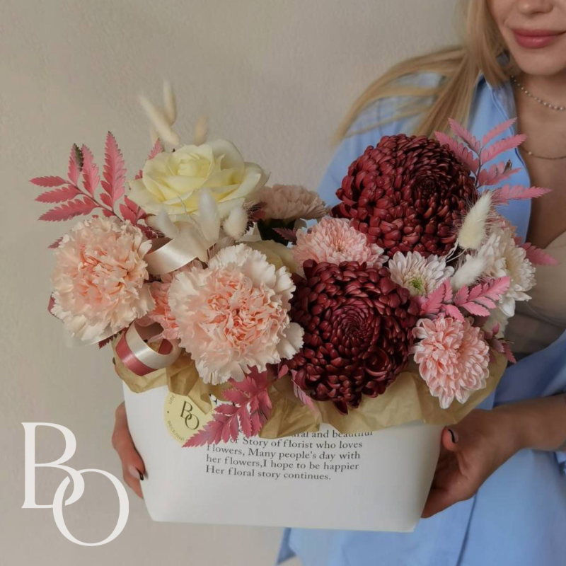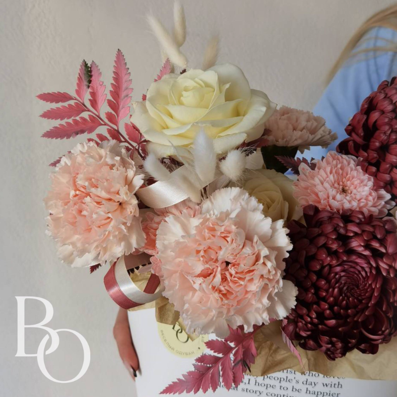 Состав: Хризантема одноголовая, Хризантема кустовая, Гвоздика, Роза, Папоротник