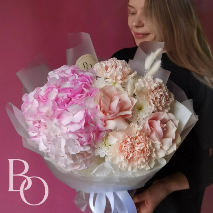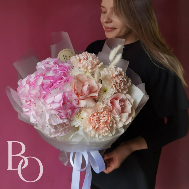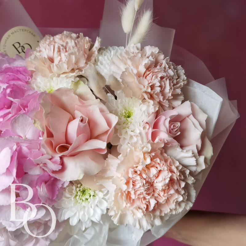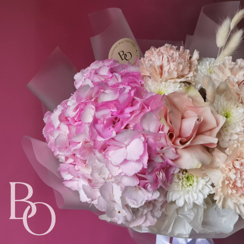 Состав: Хризантема кустовая, Лагурус (сухоцвет), Роза, Гвоздика, Гортензия