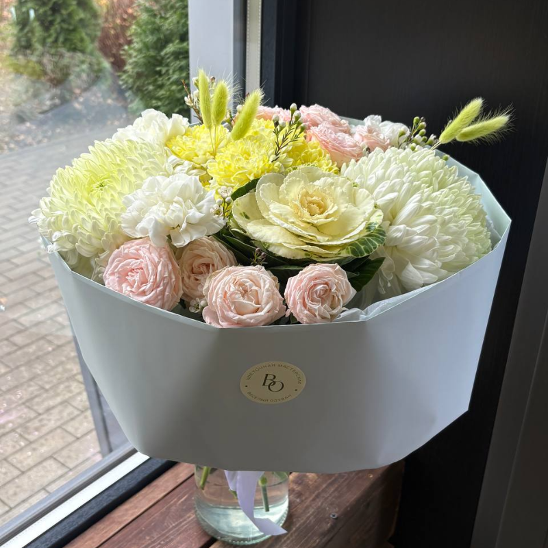 К любой цветочной композиции вы можете добавить фирменную открытку с поздравлением.