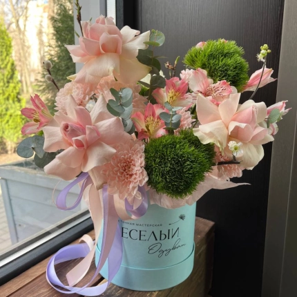 К любой цветочной композиции вы можете добавить фирменную открытку с поздравлением.