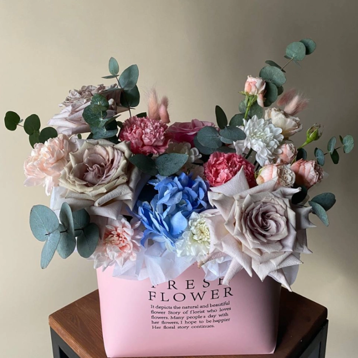 Упаковка из плотного материала, наполненная водой для транспортировки букета. Помогает сохранить свежесть цветов, пока их не переместят в вазу. *Бесплатно при заказе от 5000.