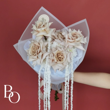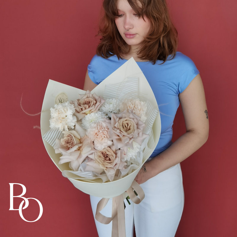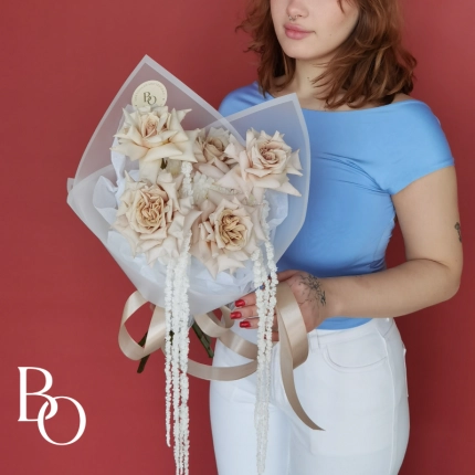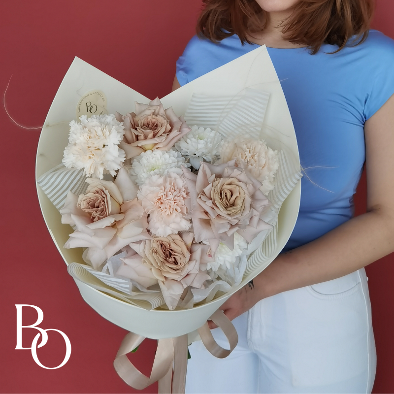 Свадебный букет формируется с использованием особой техники, позволяющей создать насыщенную и объемную композицию при небольшом размере. Заказ рекомендуется оформить за 3 недели до торжества, чтобы обеспечить своевременную подготовку. Это даст нам достаточно времени для подбора цветов и выполнения всех деталей в соответствии с вашими пожеланиями.
